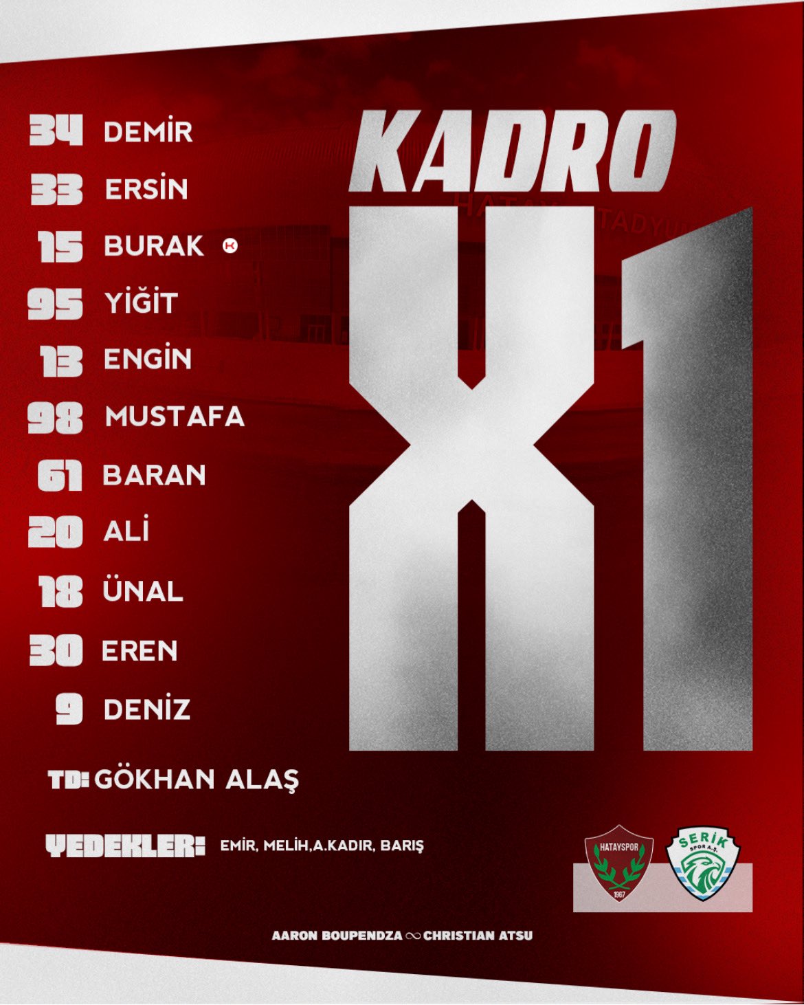Trendyol 1. Lig’de 18. hafta heyecanı sürerken, Hatayspor ile Serikspor arasında oynanacak karşılaşmanın ilk 11’leri açıklandı.