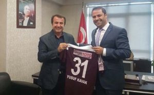 Hatayspor Kulübü Başkanı Prof.Dr. Mehmet Maden, ziyareti anısına, HAGİD Başkanı Yusuf Kavak’a, sırt kısmında ismi yazılı Bordo-Beyazlı bir forma hediye etti. -Cemil Yıldız-