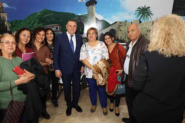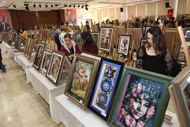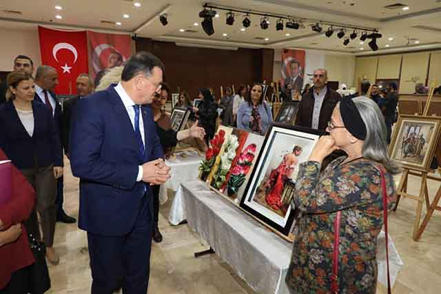 HATMEK’in Antakya’daki merkezinde eğitim alan kursiyerlerin yaptığı kâğıt rölyef, tezhip ve heykeller ile birlikte, genç ressam Alara Dodurka’nın solo resim sergisini konuklarla birlikte gezen Başkan Savaş, el emeği göz nuru sanat ürünlerini ortaya koyan herkese teşekkür etti.