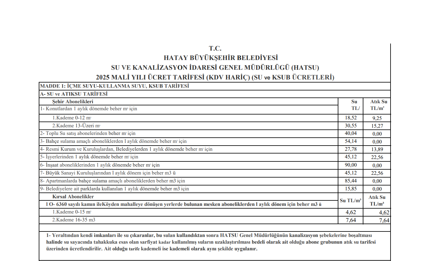 Hatay Büyükşehir Belediyesi Su ve Kanalizasyon İdaresi (HATSU), su tarifesine yaptığı yüksek zamla hem vatandaşın tepkisini çekti hem de su faturalarında yaşanan çelişkilerle tartışmalara neden oldu. Resmî açıklamalara göre 1 metreküp suyun fiyatı 18.52 TL olarak belirlenmiş olsa da, bazı abonelere kesilen faturaların 1 m³ tüketim için 124 TL’ye kadar çıktığı görülüyor.