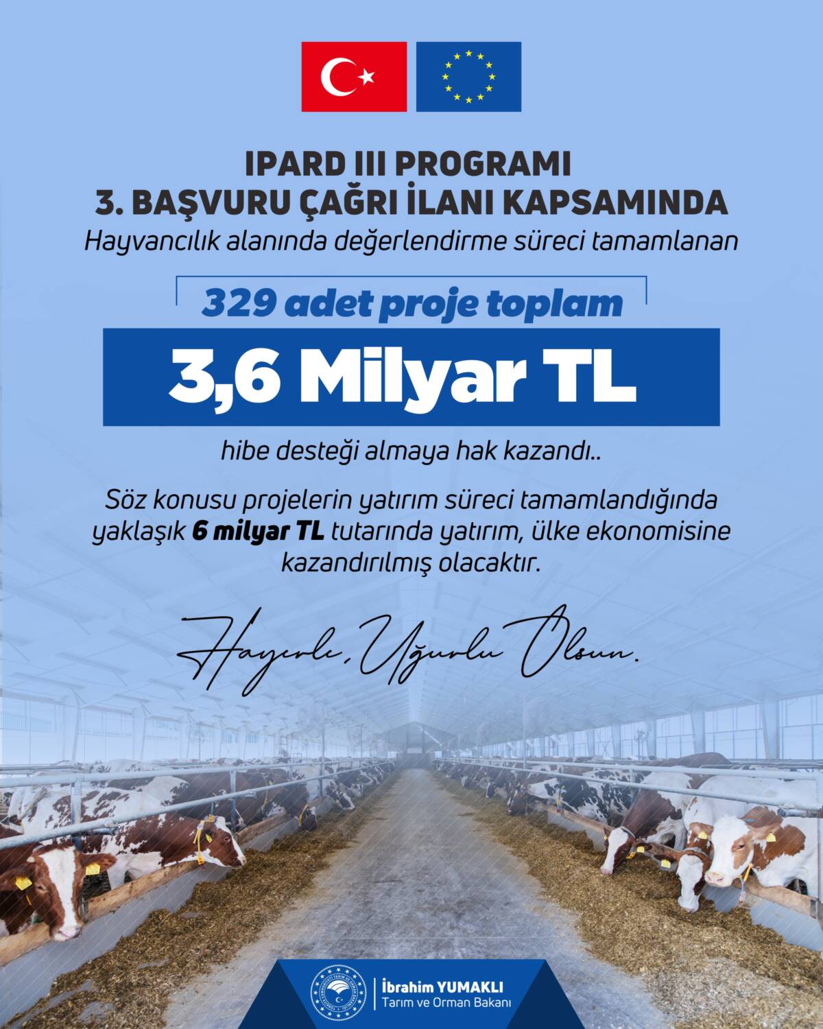 Tarım ve Orman Bakanı İbrahim Yumaklı, IPARD III Programı Üçüncü Başvuru Çağrı İlanı kapsamında gerçekleştirilen başvuruların değerlendirme sürecinin tamamlandığını ve destek almaya hak kazanan projelerin belirlendiğini duyurdu.