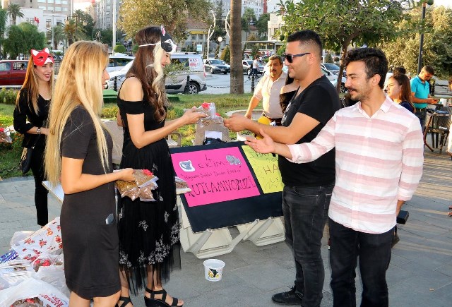 Ellerinde pankartlarla Ulus alanında bir araya gelen hayvan hakları savunucuları, burada kurdukları standta vatandaşlara kedi-köpek maması ve su kapları dağıttı. -Mehmet ÖZGÜN-