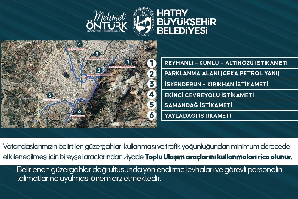 Ulaşım Dairesi yetkilileri, tören günü yaşanabilecek trafik yoğunluğunu azaltmak amacıyla belirli istikametlerin tercih edilmesini önerdi. Buna göre Reyhanlı–Kumlu–Altınözü yönü, Ceka Petrol yanı parklanma alanı, İskenderun–Kırıkhan hattı, Ekinci Çevreyolu, Samandağ ve Yayladağı istikametlerinin kullanılması tavsiye edildi.
