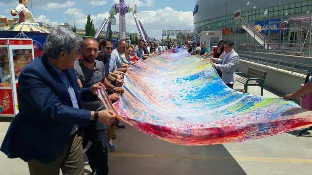 Defne ilçesi Sümerler Mahallesi’ndeki Vilayetler Hizmet Birliği Anaokulu öğrencileri, “100 Metrekare Dünyanın En Büyük Ebru Çalışması”nı gerçekleştirerek Guinness Rekorlar Kitabı’na girmeye hazırlanıyor. Primemall Avm’nin açık otoparkında gerçekleşen çalışmaya, Defne Belediye Başkanı Op. Dr İbrahim Yaman da katıldı. Vilayetler Hizmet Birliği Anaokulu Müdürü Şevki Fakıoğlu önderliğinde, 20 Öğretmen ve 400 öğrencinin gerçekleştirdiği Ebru çalışması hayranlık uyandırdı. Guinnes Rekorlar Kitabı’na girmeye hazırlanılan çalışma 4-5 yaşlarındaki öğrencilerin minik elleriyle hazırlanırken, noter huzurunda gerçekleşti ve resmiyet kazandırıldı.
