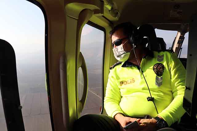 İl Emniyet Müdürlüğü Bölge Trafik Denetleme Şube Müdürlüğü ekipleri, Havacılık Dairesi Başkanlığına ait helikopterle Hatay genelinde trafiğin yoğun olduğu kara yollarında denetim gerçekleştirdi.