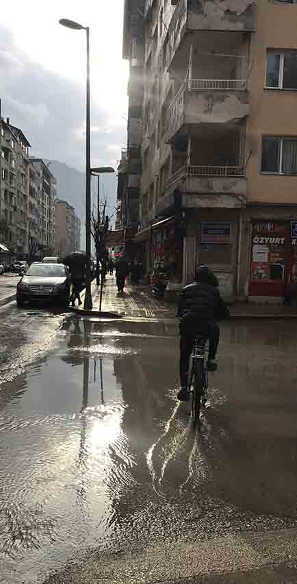 Karşıdan karşıya geçerken de, kaldırımda otobüs beklerken de, elde şemsiye ilerlerken de durum değişmiyor. Antakya kent merkezinde yolların ve kaldırımların bakımsız hali, yağan yağmurla beraber bir çok yeri Venedik hikayesinde buluşturmaya yetti.