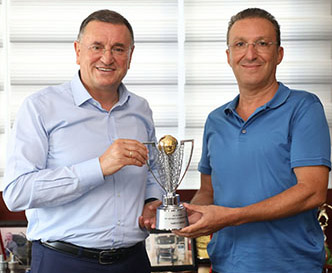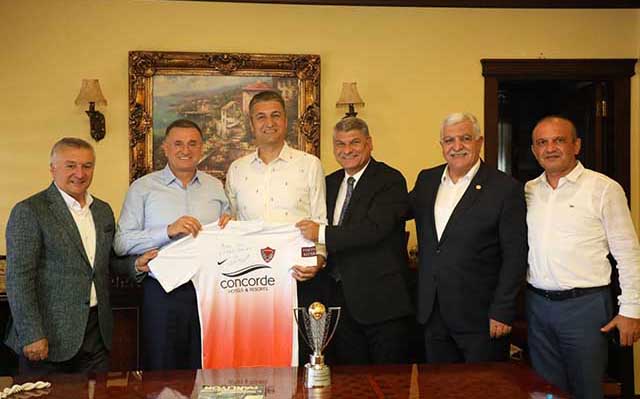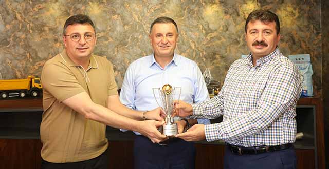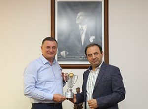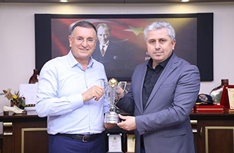 Hatay BŞB Başkanı Lütfü Savaş ve Hatayspor Yönetimi, İskenderun’da, Kulübe destek olan şirketleri dolaştı ve birer “Mini şampiyonluk kupası” hediye etti.