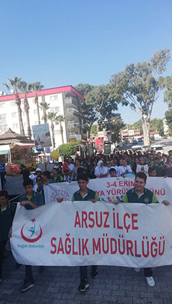 Arsuz İlçe Sağlık Müdürlüğü tarafından, 3-4 Ekim Dünya Yürüyüş Günü kapsamında “Sağlığınız İçin Her Gün 10 Bin Adım” yürüyüş etkinliği düzenlenirken, genel mesajı, “Koş, Yürü, Oyna, Sağlıklı Yaşa” olan etkinliğe; resmi-özel kurum temsilcileri, gençler, esnaf, öğrenciler ve her kesimden vatandaşlar katıldı. -Cemil Yıldız-