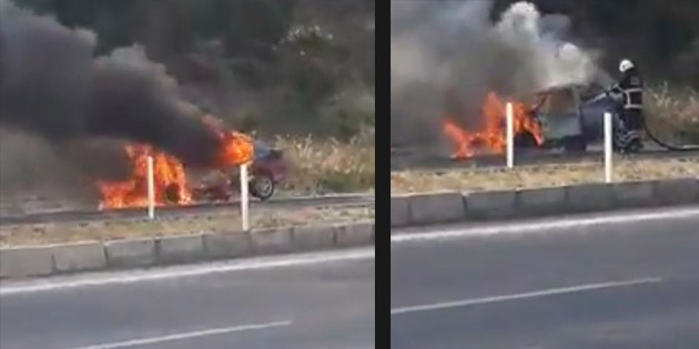 Seyir halindeki araç cayır cayır yandı, alevler içinde kaldı, dumanlar yükseldi.