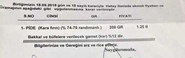 Hatay Esnaf Odaları Birlik Başkanı Kadir Teksöz imzasıyla ekmek ve simide zam kararı, 18 Eylül 2018 tarih ve 18 saylı kararla alındı ve tüm İlçe Belediyeleri ile Esnaf Odalarına duyuruldu. -Cemil Yıldız-