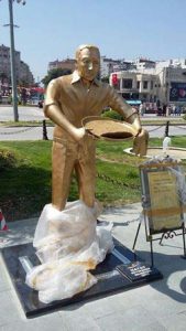 “2018 Gastronomi Şehri olarak, Hatay’ımız seçildi. Bundan kaynaklı, biz de, heykeltıraşlar olarak ‘Hatay’ı ne simgeler’ diye düşündük. Hatay’ımız, künefe ile meşhur. ‘Hatay’ımıza ilk heykeli künefeci olarak yerleştirelim’ dedik. Tepsi bildiğimiz demir. Künefe dokusu verilmeye çalışıldı, elyafla. Umarız heykelimize bundan sonra bir zarar gelmez. İyi davranılsın ki, bundan sonraki süreçlerde daha iyi heykeller ortaya çıksın.” -Tamer Yazar-