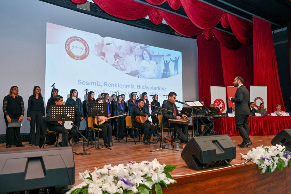 Hatay Mustafa Kemal Üniversitesi tarafından 3 Aralık Dünya Engelliler Günü kapsamında “Sesimiz, Renklerimiz, Hikâyelerimiz” temalı kapsamlı bir program gerçekleştirildi. Atatürk Konferans Salonunda düzenlenen etkinlikte panel, konser ve sergi gibi birçok çalışma yer aldı. Program, saygı duruşu ve İstiklal Marşı’nın ardından Antakya Devlet Konservatuvarı tarafından sunulan müzik dinletisi ve down sendromlu Ali Çolakoğlu’nun zeybek gösterisiyle başladı.