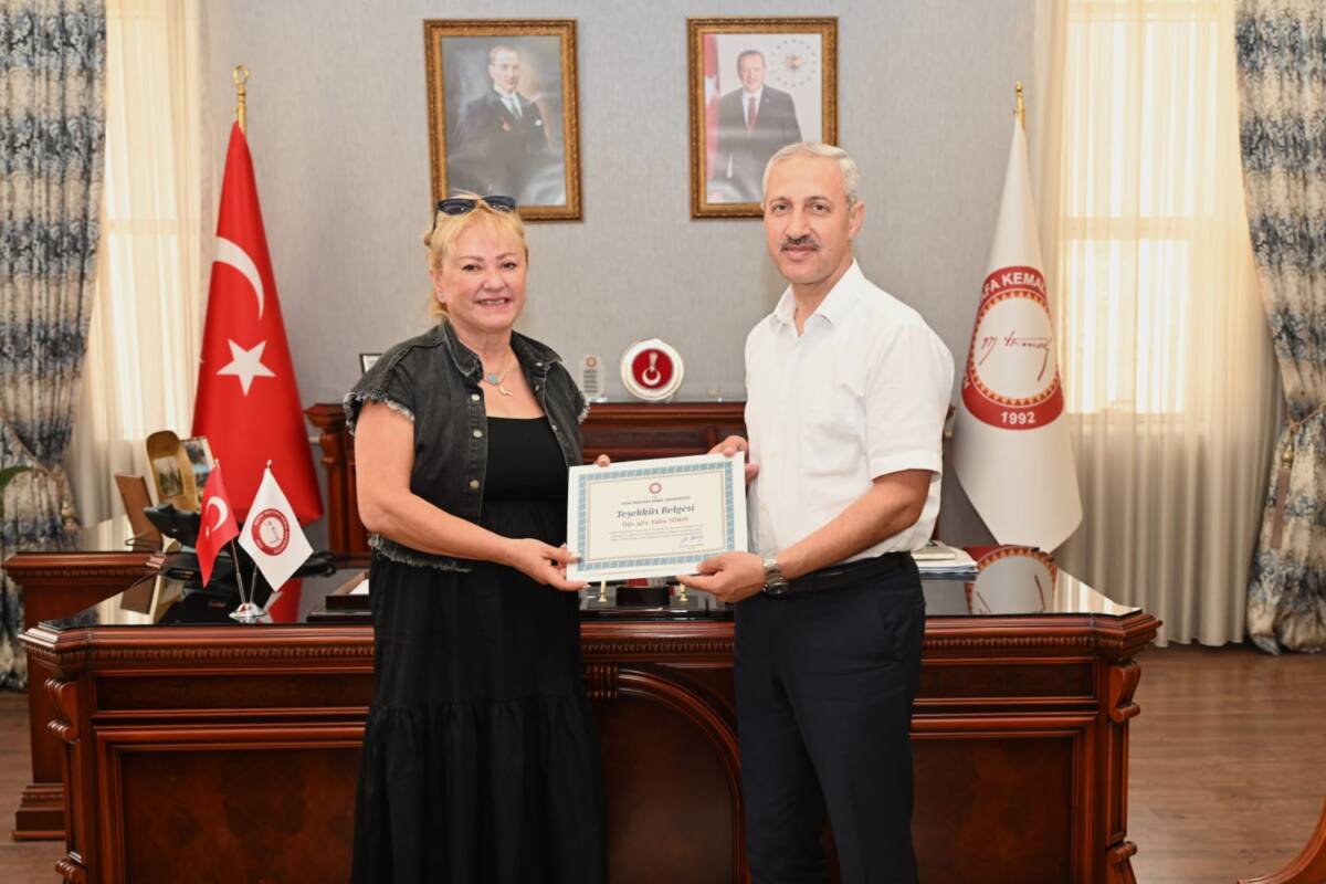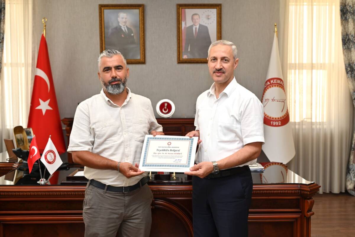 Hatay Mustafa Kemal Üniversitesi (HMKÜ) Rektörü Prof. Dr. Veysel Eren, üniversite yerleşkesinde depremde hasar gören Osmanlı tarzı taş çeşme ile Bilim Yolu heykelinin restorasyonunu gerçekleştiren Sanat ve Tasarım Meslek Yüksekokulu öğretim elemanları Öğr. Gör. Tülin Tümay ve Öğr. Gör. Dr. M. Hasan Demirci’ye teşekkür belgesi takdim etti.