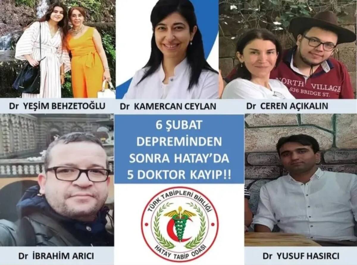 “Depremde 63 meslektaşımızı kaybetmenin derin üzüntüsünü yaşıyoruz. Ancak en büyük acımız, meslektaşlarımızdan bazılarına hâlâ ulaşılamamış olmasıdır. Dr. Yeşim Behzetoğlu, Dr. Kamercan Ceylan, Dr. Ceren Açıkalın, Dr. İbrahim Arıcı ve Dr. Yusuf Hasırcı’nın cenazelerine erişemedik. Hepimizi derinden yaralayan bu kayıpların hatırasını yaşatacağız. Hepinizi Özledik!!!””
