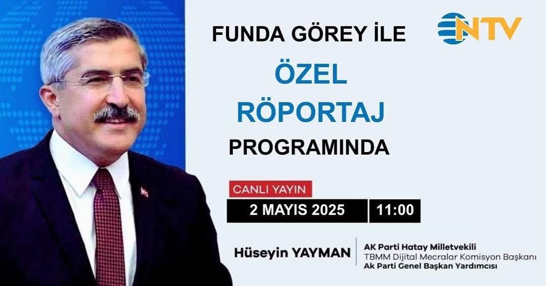 AK Parti Genel Başkan Yardımcısı, Hatay Milletvekili ve TBMM Dijital Mecralar Komisyonu Başkanı Hüseyin Yayman, bugün NTV ekranlarında izleyiciyle buluşuyor.