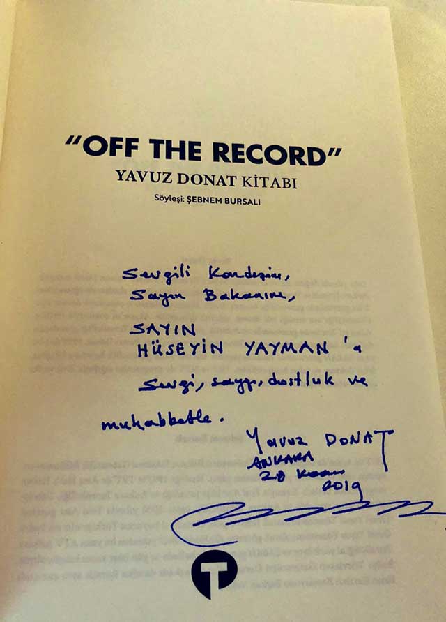 “Yaşayan efsane, ülkemizin en önemli gazetecilerinden Değerli Yavuz Donat Beyfendiyi ziyaret edip, yeni kitabını imzalattık. Yavuz Ağabeyin, şahsıma yönelik güzel sözlerine teşekkür ederim. Türk Basınının ve siyasetinin hafızasını anlatan ‘Off The Record’ kitabını herkes okumalıdır.”