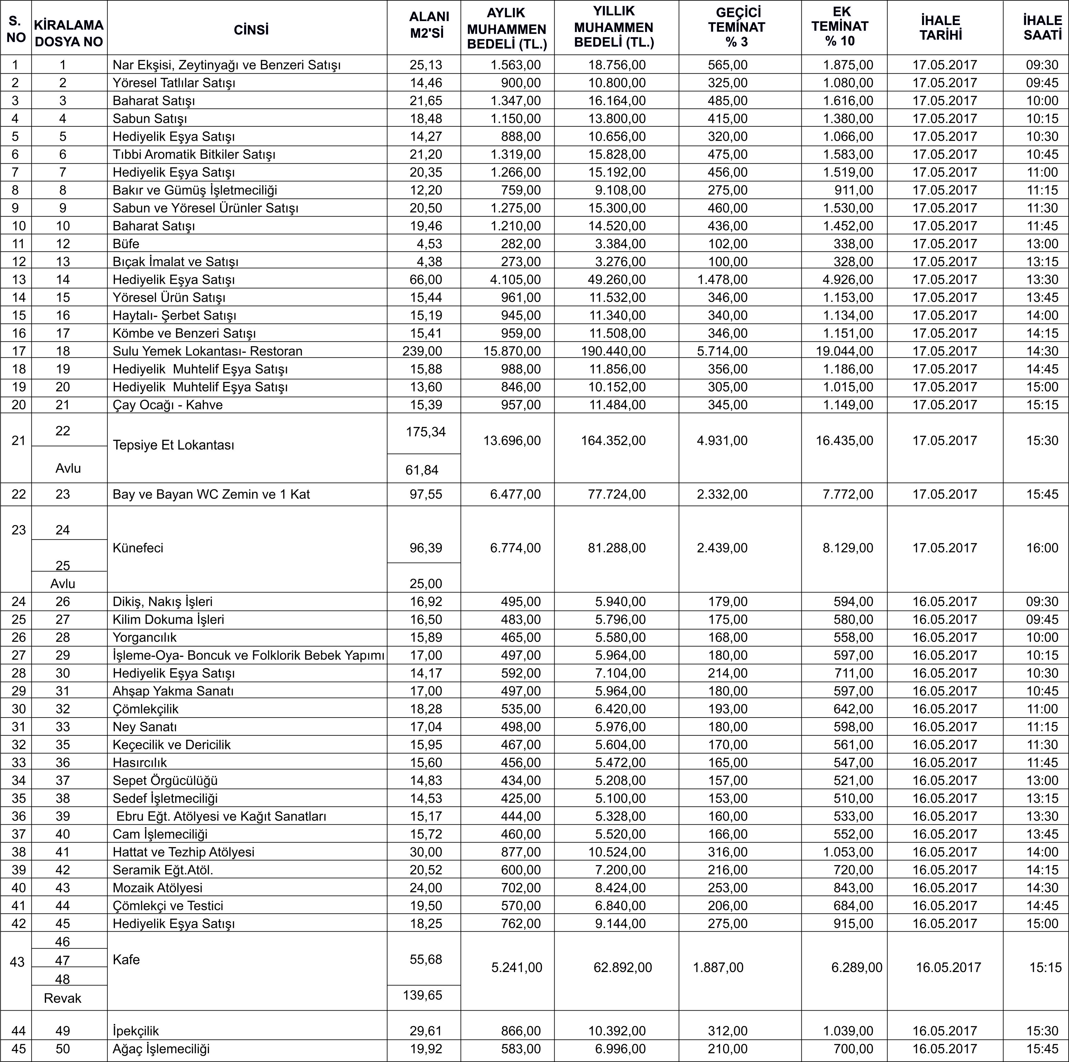 1- Mülkiyeti Hatay Valiliği Yatırım İzleme ve Koordinasyon Başkanlığına ait yukarıda her türlü özelliği belirtilmiş olan 3. derece arkeolojik sit alanı koruma amaçlı kayıtlı tescilli kültür varlığı vasıflı taşınmazlar mevcut haliyle (Taşınmazların m2 alanları Adana Kültür Varlıklarını Koruma Bölge Kurulu tarafından onaylanan restorasyon projeleri esas alınmış olup; işyerlerinin m2 si bu şekilde kabul edilmiş olacaktır.) 16 ve 17 MAYIS 2017 SALI ve ÇARŞAMBA Günü İlan Metninde belirtilen saatinde, Kışlasaray Mahallesi, Fevziçakmak Cad. No: 17 Antakya/HATAY adresindeki Hatay Valiliği Yatırım İzleme ve Koordinasyon Başkanlığı Hizmet Binası İhale salonunda 2886 Sayılı Yasanın 51/g Maddesi gereği, Pazarlık Usulü ile hizalarında gösterilen muhammen bedeller üzerinden kiraya verilecektir. Sözleşme tarihinden 31.12.2017 tarihine kadar ihale bedeli üzerinden, 2018 ve 2019 yılları içinde İhalede ortaya çıkacak aylık kira bedeline periyodik olarak Devlet İstatistik Enistüsü tarafından yayınlanan Üretici Fiyat Endeksi’nin oniki aylık ortalamalara göre değişim oranından az olmamak kaydıyla, kira artışı yapılmak şartıyla 31.12.2019 tarihine kadar kiraya verilecektir. Kira süresinin sonunda, sürenin uzatılması halinde taşınmazın emsal ve rayiç bedeli baz alınrak kira artışı yapılacaktır. Kira artışını kabul etmeyenlerin kira müddeti uzamamış sayılacak ve 2886 sayılı Devlet İhale Kanununun 75. maddesi gereğince tahliyesi sağlanacaktır.