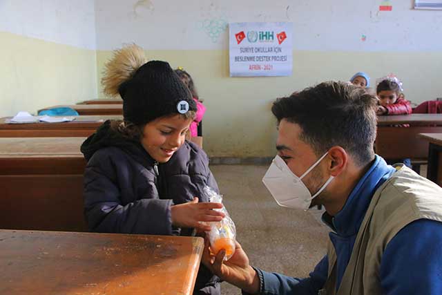 Suriye’deki okullarda; öğretmen, sıra, masa, yazı tahtası, kırtasiye malzemesi kadar beslenme ihtiyacı da önemli bir sorun teşkil ediyor. Bu sorunu gidermek amacıyla, bağışlarla yürütebileceğimiz Sevgi Öğünü Projesi’ni hayata geçirdik” ifadesini kullandı.