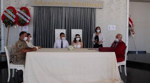 “Aycan Girgeç ile Birkan Avara” çiftinin nikah töreninde de kovid ön-lemleri tam anlamıyla uygulandı. Genç çift, aileleri, törene katılanlar ve belediye başkanı olmak üzere, salondaki herkes maske taktı, sosyal mesafeye uymaya çalıştı. -Mehmet Durmaz-