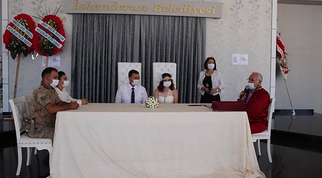 İskenderun’da gerçekleşen iki nikah töreninde, örnek dedirtecek türden, kovid kriterlerine uyum tam oldu. İskenderun Belediye Başkanı Fatih Tosyalı’nın nikahlarını kıydığı “Aysun Dingil ile Şükrü Hükümdar” çiftinin mutlu gününde, gelin-damat ile aileleri ve törene katılanların tamamı maske takarak törende yerini aldı. Nikahı kıyan Belediye Başkanı Fatih Tosyalı ve nikah görevlileri de maskeli olarak törende yerlerini alarak, örnek bir tutum sergiledi.