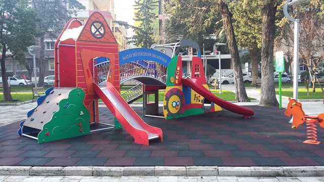Antakya Belediyesi tarafından yapılan çocuk oyun alanı, toprak zemin üzerinde yükseltilmiş. Yer yer eğimler dikkat çekiyor… Çocukların en çok kullandığı ‘kaydırağın’ bittiği nokta ise bir çocuk için hayli yüksekte bırakılmış. Düzeltilmemiş ve yer yer çimlenmiş zemin ise, koşan çocuklar için olası kaza noktaları oluşturmuş. Oyun alanındaki ekipmanların yer yer paslanmış ve boyaları atmış hali ise eleştirilen başka noktalar!