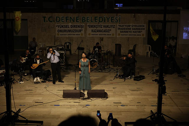 Eğitim-Sen Genel Merkezi tarafından görevleri ve üyelikleri askıya alınan Hatay Eğitim-Sen Yürütme Kurulu’nun düzenlediği İlkay Akkaya Konseri, Defne Sümerler Amfi Tiyatro’da, muhteşem bir kalabalık ve muhteşem bir coşkuyla geçti. Genel Merkez’in kararı ile görevden alınan Hatay Eğitim-Sen üyesi isimlerin Sümerler Amfi Tiyatro’da halktan görmüş olduğu desteğin, Eğitim-Sen Genel Merkezi’nin, “görevden alma kararını”, örgütlü bir toplumu bölmeme ve parçalamama adına bir daha gözden geçirme gerekliliğini ortaya koyduğu öne sürüldü.