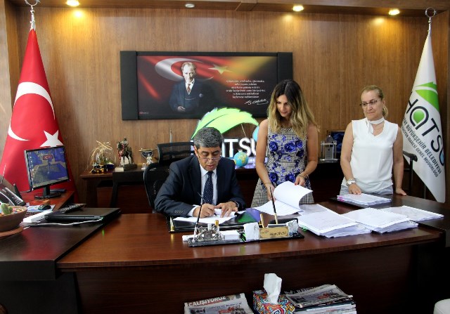 İki ilçenin altyapı hizmeti için HATSU ve EBRD arasında HATSU Genel Müdürlüğü’nde düzenlenen imza programına Hatay Büyükşehir Belediye Başkanı Doç. Dr. Lütfü Savaş, HATSU Genel Müdürü Mehmet Çaparali, HATSU Genel Müdür Yardımcısı Hüsna Karayazgan ve EBRD Belediye ve Çevre Yatırımları Müdürü Fatih Türkmenoğlu hazır bulundu.