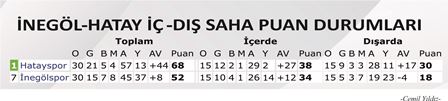 İnegölspor ile Hatayspor, Pazar günü 31.maçlarına çıkacak. Bu zorlu randevu öncesi iki takımın içeride ve dışarıda puan durumları şöyle: