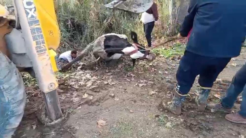 Ekipler, Hatay Büyükşehir Belediyesi’ne ait iş makinesi ve halat yardımıyla ineği güvenli bir şekilde dere kenarından çıkararak sahibine teslim etti.