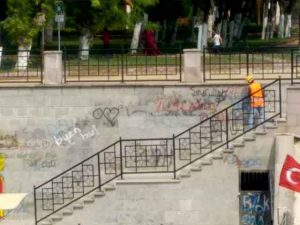 Büyükşehir yetkilileri, duvara yazı yazılmamasını, halkın kullanımına ait yerlere zarar verilmemesini bir kez daha istedi. -Mehmet ÖZGÜN-