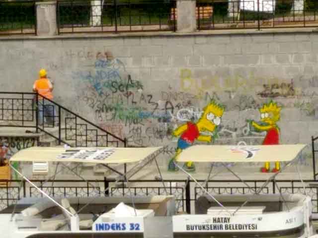 Asi nehri park kıyısındaki iskelenin duvarları, Hatay Büyükşehir Belediyesi ekipleri tarafından itinayla temizlendi, sprey boya ile yazılan mesajlar, aşk nağmeleri, resimler giderildi.