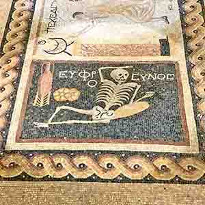 İskelet Mozaiği, Müze’ye gelenlerin en fazla ilgilendiği mozaiklerin başında geliyor, ki en çok da, üzerinde ne yazdığıyla dikkat çekmişti… Bugün Müze’ye gelenler mi? Türkçe ve İngilizce tabelalar arasındaki farka dikkat çekiyor! Sahi hangisi tam karşılığı? Türkçesi mi? İngilizcesi mi? Öncesi mi?