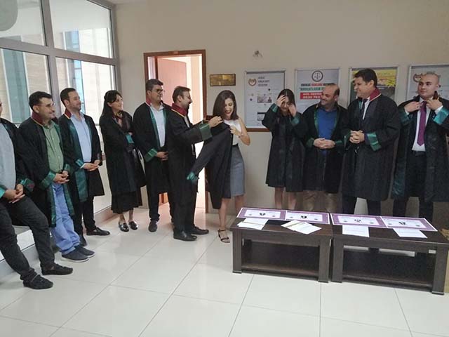Baro Başkanı Av. Ekrem Dönmez, genç meslektaşlarını kutladı ve başarı diledi. Törene; Başkan Yardımcısı Av. Sevinç Çakıcı, TBB Delegesi Av. Murat Güler, Yönetim Kurulu üyeleri Av. Hüseyin Derin, Av. Mehmet Bilgili, Av. Adnan Eryılmaz, Av. Yusuf Albayrak ve Av. Oktay Çaparoğlu katıldı. -Selvi Günay-