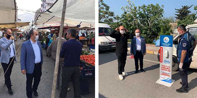 Ekiplerimiz, diğer yandan da pazar giriş ve çıkışlarında, halkımıza dezenfektan, maske ve eldiven dağıtımı gerçekleştiriyor. Birlikte başaracağız” dedi. Mehmet ÖZGÜN
