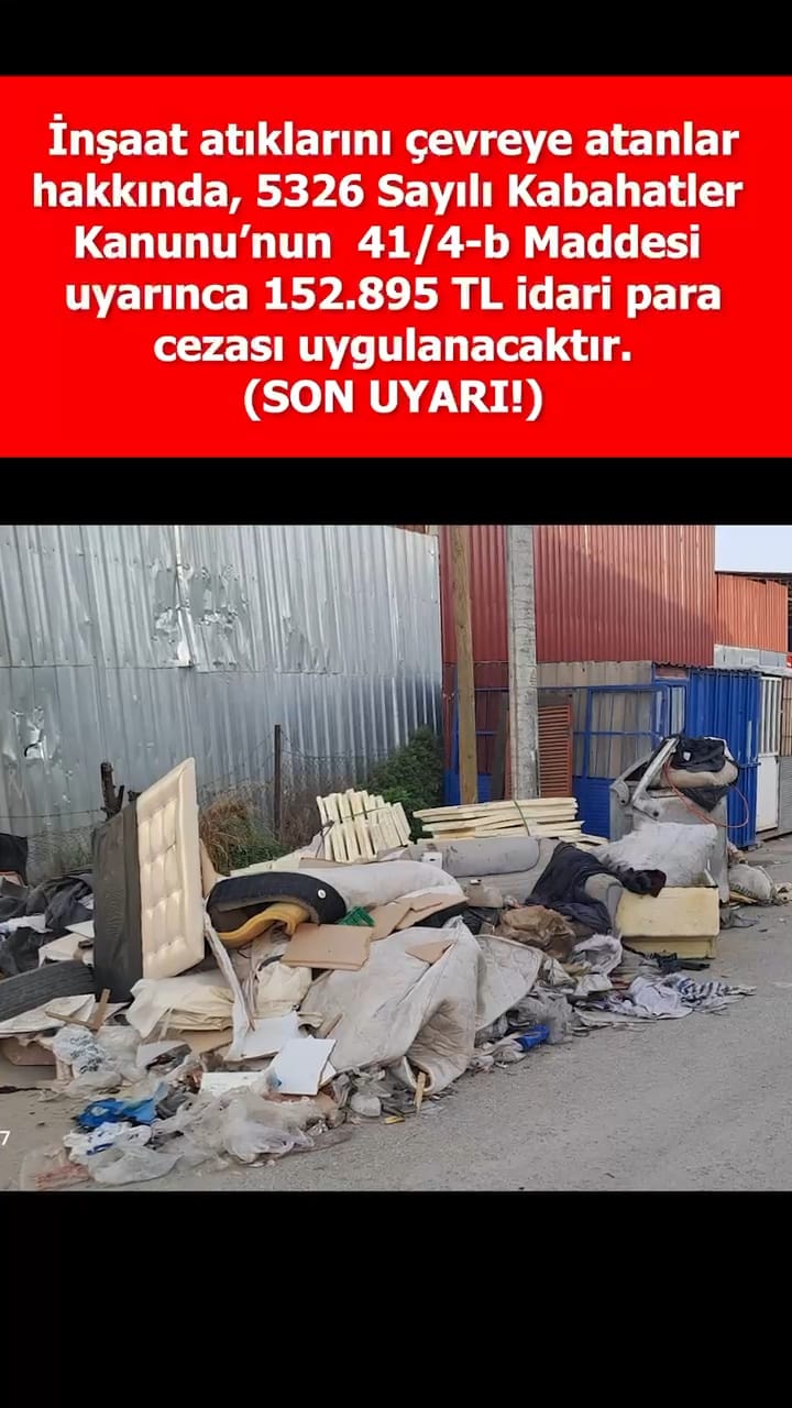 Başkan Dönmez, paylaşımında “İskenderun Belediyesi çevre temizliği noktasında kent genelinde inşaat atıklarını çevreye atanlar hakkında, 5326 sayılı Kabahatler Kanunu’nun 41/4-b maddesi uyarınca 152 bin 895 TL idari para cezası uygulanacaktır” ifadelerine yer verdi.