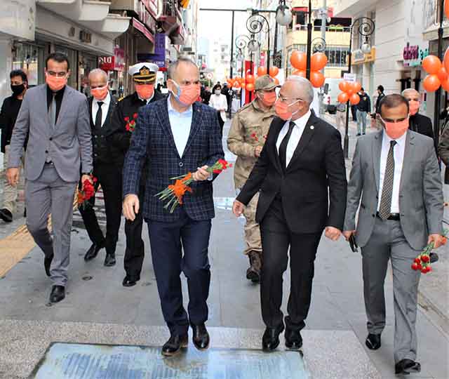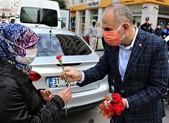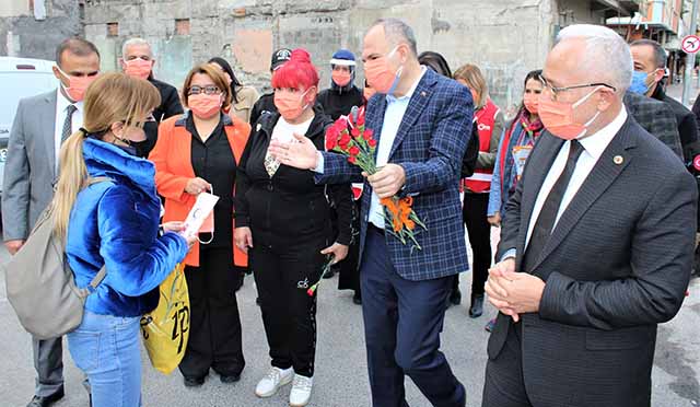 İskenderun’da, İlçe Kaymakamı ile İlçe Belediye Başkanı, birlikte sokağa çıktı ve 25 Kasım Kadına Yönelik Şiddetle Mücadele Günü kapsamında kadınlara çiçek verdi.