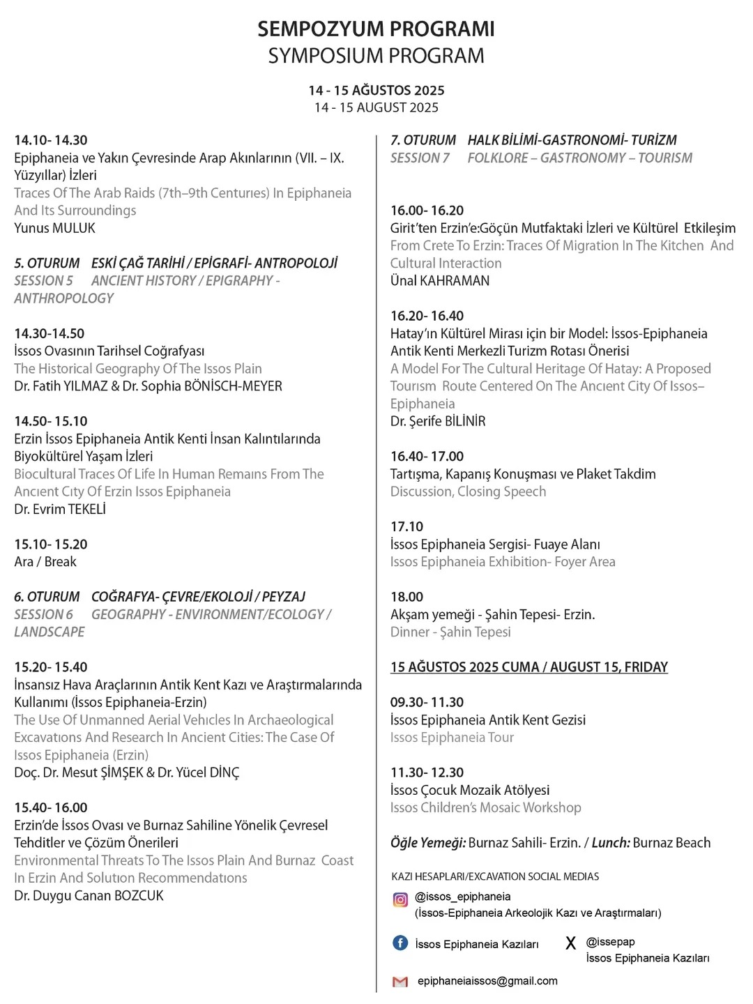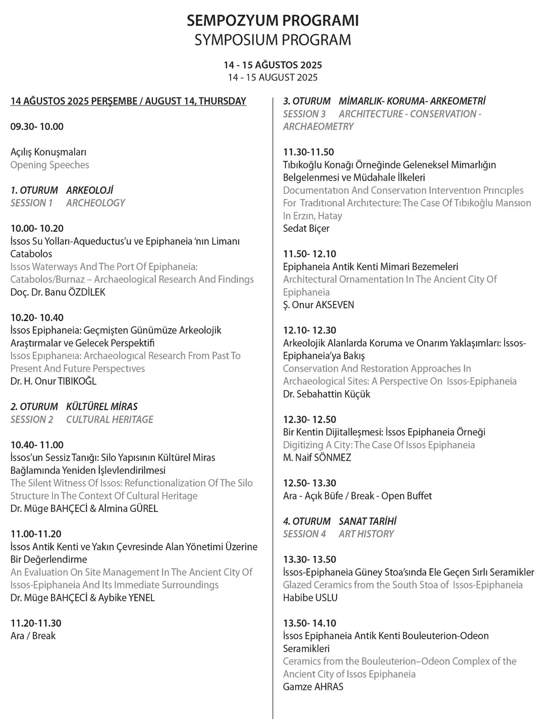 Başlıca konuşmacılar arasında Dr. Banu Özdilek, Dr. Fatih Yılmaz, Dr. Sophia Bönisch-Meyer, Doç. Dr. Mesut Şimşek, Dr. Şerife Bilinir ve birçok akademisyen yer alacak. Sunumlarda İssos’un su yolları, antik limanı, mozaikleri, yapı bezemeleri, dron teknolojisiyle yapılan kazılar ve Erzin mutfağında göçün izleri gibi konular dikkat çekiyor.