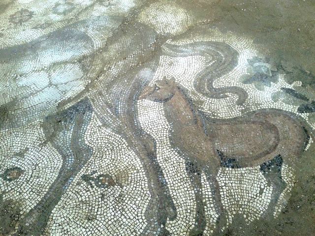 Bir at ve yanı başında bir tay… Annesinin yanında resmedilen bir at figürü. Çıkan mozaikler arasında hayvan desenleri dikkat çekiyor, özellikle de kuşlar. Ağaç ve çiçekler de… Ancak bulunan mozaiklerde ortak bir kısım var! Hepsinde ciddi bir yıpranmışlık var, hatta kırılmalar, ezilmeler… Şu ana kadar cevap verilmemiş olsa da, geçmiş dönemde gerçekleşen bir belediye altyapı çalışmasının bu mozaiklerin bu hale gelişinde ciddi etken olduğu söyleniyor.