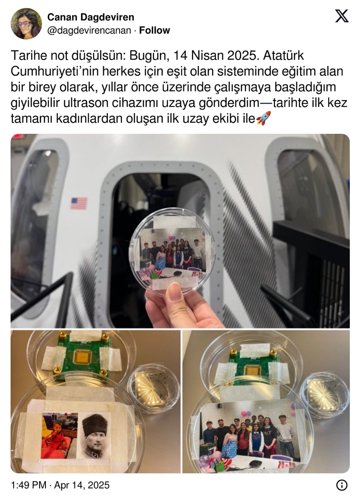 Dünya tarihinde ilk kez tamamı kadınlardan oluşan bir ekip, başarılı bir şekilde uzay yolculuğuna çıktı. Bu özel görevde Türkiye’den bir isim, bilimsel başarısıyla dikkatleri üzerine çekti. Massachusetts Institute of Technology (MIT) bünyesinde çalışmalarını sürdüren Türk bilim insanı Canan Dağdeviren, meme kanserinin erken teşhisini sağlayan giyilebilir ultrason cihazını uzaya göndererek önemli bir ilke imza attı.