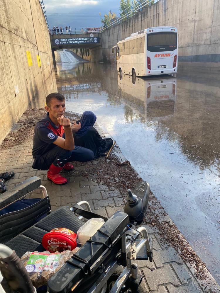 Payas ilçesinde ise Şehit Yetkin Erşan Alt Geçidi, yoğun yağış nedeniyle suyla doldu. Bu sırada akülü aracıyla alt geçide giren yaşlı bir kadın, suyun içinde mahsur kaldı ve boğulma tehlikesiyle karşı karşıya geldi.