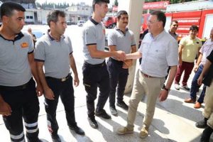 Savaş, itfaiye personeliyle kısa süreli sohbette bulundu, özveriyle görev yaptıkları için de onlara