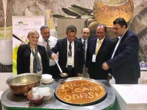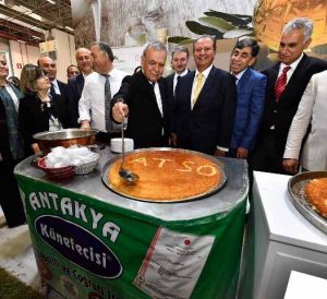 Hatay ilini temsilen 12 üretici firma ile Hatay Zeytincilik Araştırma Enstitüsü’nün katılımları kapsamında ilimizin zeytin ve zeytinyağı üretimi tanıtıldı. DOĞAKA koordinasyonunda; Hatay, Kahramanmaraş ve Osmaniye illerinden bölgemizi temsilen katılım sağlayan 15 zeytin, zeytinyağı, süt ve süt ürünleri üreticisi ile bölgesel katılım sağlanan söz konusu fuarın açılış gününde, standımızı KKTC Tarım ve Doğal Kaynaklar Bakanı Erkut Şahali, Gıda Tarım ve Hayvancılık Bakanlığı Müsteşar Yardımcısı Ahmet Güldal, İzmir Büyükşehir Belediyesi Başkanı Aziz Kocaoğlu ve beraberindekiler ziyaret ederken, katılımcılara Antakya Künefesi ikram edildi. -Cemil Yıldız-