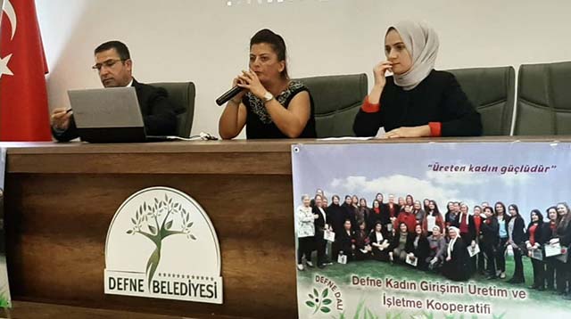 Ticaret Bakanlığı ve Tarım ve Orman Bakanlığı arasında imzalanan “Kadın Kooperatiflerinin Güçlendirilmesi İşbirliği Protokolü” kapsamında ilimizde oluşturulan Çalışma Grubu tarafından düzenlenen “Kadın Kooperatiflerinin Güçlendirilmesi 2019 Yılı Faaliyet Planı” doğrultusunda, Defne Kadın Girişimi Üretim ve İşletme Kooperatifi tarafından bir panel düzenlendi. Düzenlenen panel; Hatay Ticaret İl Müdürü Hamit İmrek, Defne Sosyal Yardımlaşma Vakfı Müdürü Bekir Yıldırım, Defne Belediye Başkan Yardımcısı Girne Mansuroğlu, Şanlıurfa Karaköprü Belediye Meclis Üyesi Seher Kılınç, Kastamonu Sarı Konak Kadın Kooperatifi Başkan ve üyeleri, ilimizde bulunan aktif kadın kooperatifleri başkan ve üyelerinin katılımlarıyla, Defne Evi Konferans Salonu’nda 60 kişinin katılımıyla gerçekleştirildi.