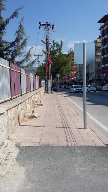 Eldeki son örneğimiz, Hatay Büyükşehir Belediyesi’ne bağlı HATMEK’e inen kaldırım noktasında! Normal şartlarda bu alandaki yolla beraber kavşağı dönen kaldırım, kavşak noktasına gelmeden ‘kesilmiş’, hatta kesilmekle de kalmamış, ortadan kaldırılmış! Buraya kadar gelenler ise o yüzden şaşkın. Çünkü ortada bu yapılana dair ne bir işaret ne de bir uyarı ile karşılaşıyorlar. Gördükleri