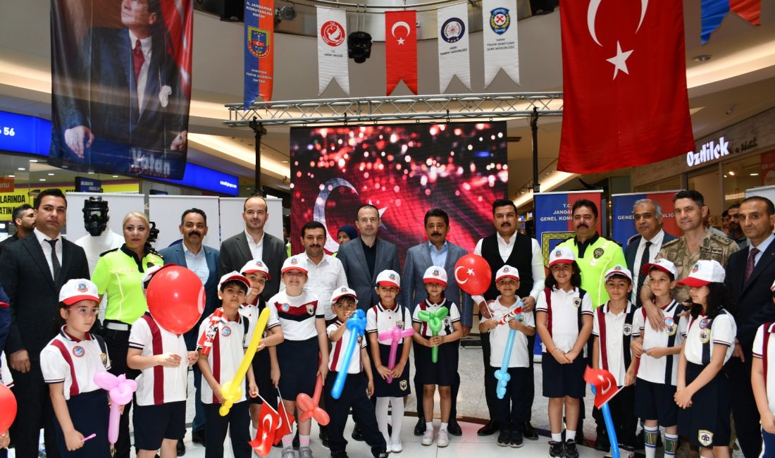 Kentteki bir alışveriş merkezinde oluşturulan etkinlik alanında başta çocuk ve gençlerin trafik güvenliği hakkında bilgi sahibi olmasının önemi anlatıldı.