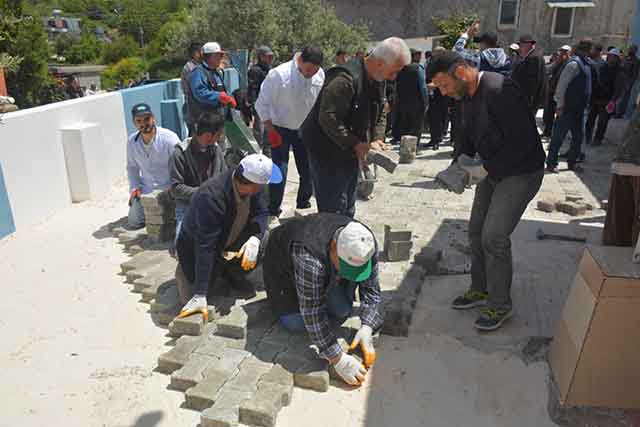 Altınözü-Kılıçtutan Mahallesi halkı el ele verdi, mahalle okulunun bahçesini parke ile kapladı.