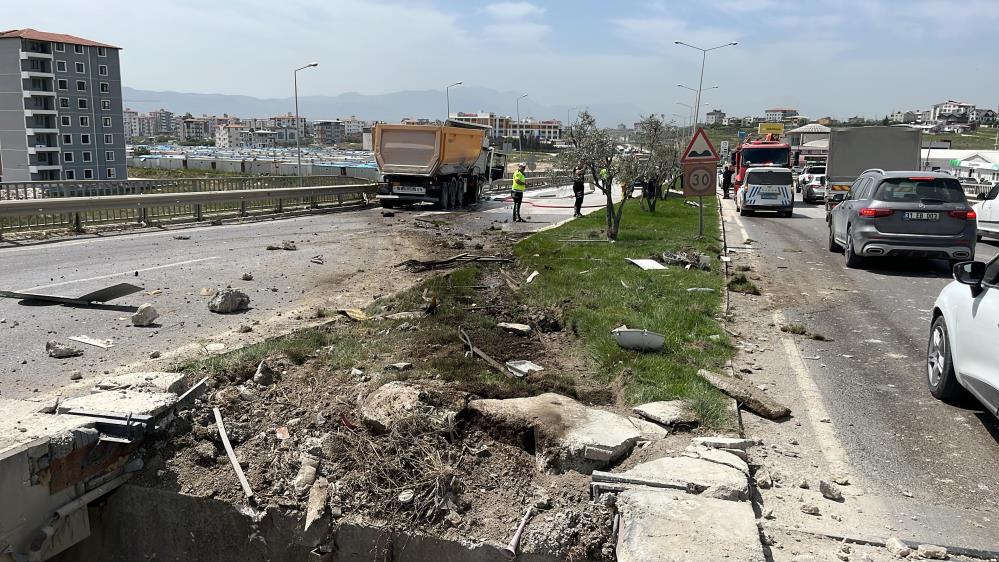 Hatay’ın Antakya ilçesinde meydana gelen kazada, sürücüsünün kontrolünü kaybettiği hafriyat kamyonu karşı şeride geçip üst geçit bariyerine çarparak durabildi. Olayda bir kişi yaralandı.