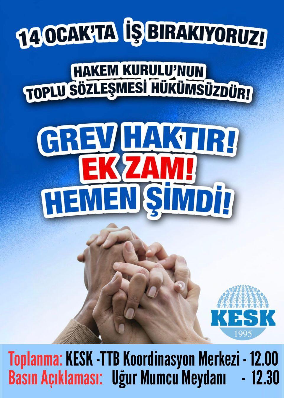 Kamu Emekçileri Sendikaları Konfederasyonu (KESK), kamu çalışanlarının ücret ve özlük haklarına ilişkin taleplerini dile getirmek amacıyla 14 Ocak’ta iş bırakma eylemi gerçekleştireceğini duyurdu.