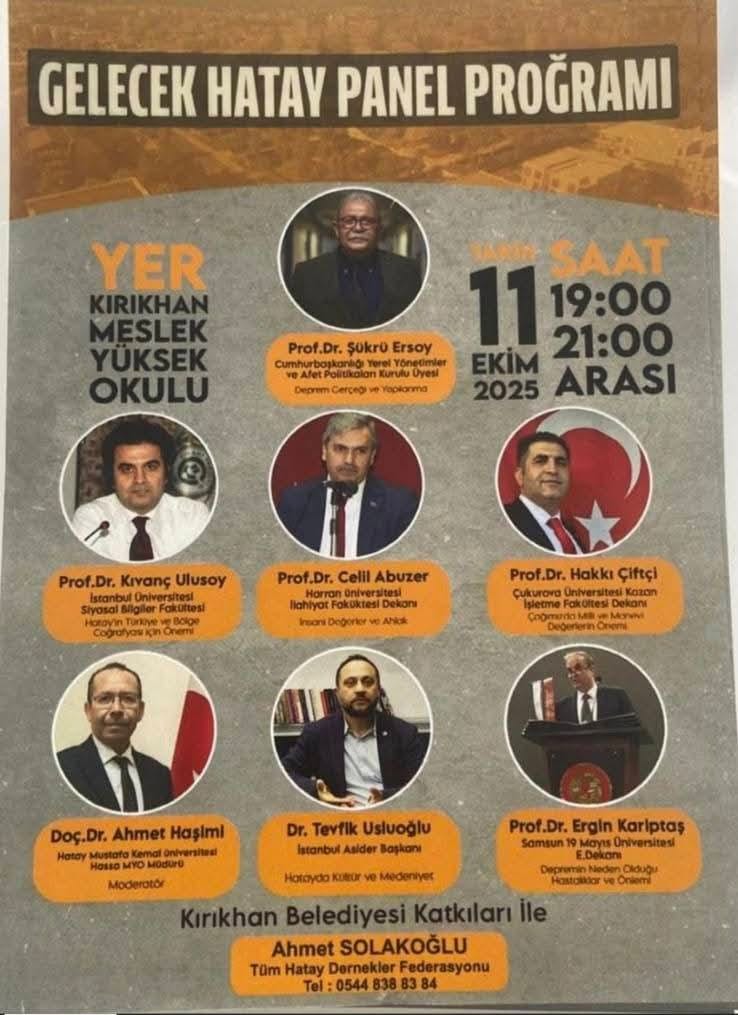 Kırıkhan Belediyesi’nin katkılarıyla, Kırıkhan Belediye Başkanı Ömer Erdal Çelik ve Tüm Hatay Dernekler Federasyonu adına Ahmet Solakoğlu ev sahipliğinde, Kırıkhan Meslek Yüksekokulu’nda “Gelecek Hatay Paneli” düzenlendi.