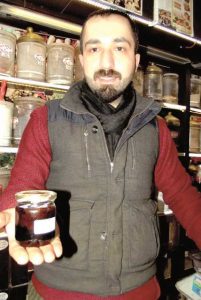 “Her sene geldiğinde, müşterilerimize geleneksel olarak hazırladığımız, doğal bir antibiyotik olarak verdiğimiz, hiçbir şekilde kimyasal olmayan, tamamen şifalı bitkilerden hazırlanmış bir karışımımız var. İçinde ne var diye sorarsanız eğer… Zencefil, zerdaçal, karanfil, çörek otu, keçiboynuzu tozu, arı sütü ve polen. Bunu talep eden müşterilerimize önceleri toz halinde veriyorduk ama, bu sene bu karışımı keçiboynuzu özü ile birleştirip, ardından da kavanozlayıp bu hale getirdik.”